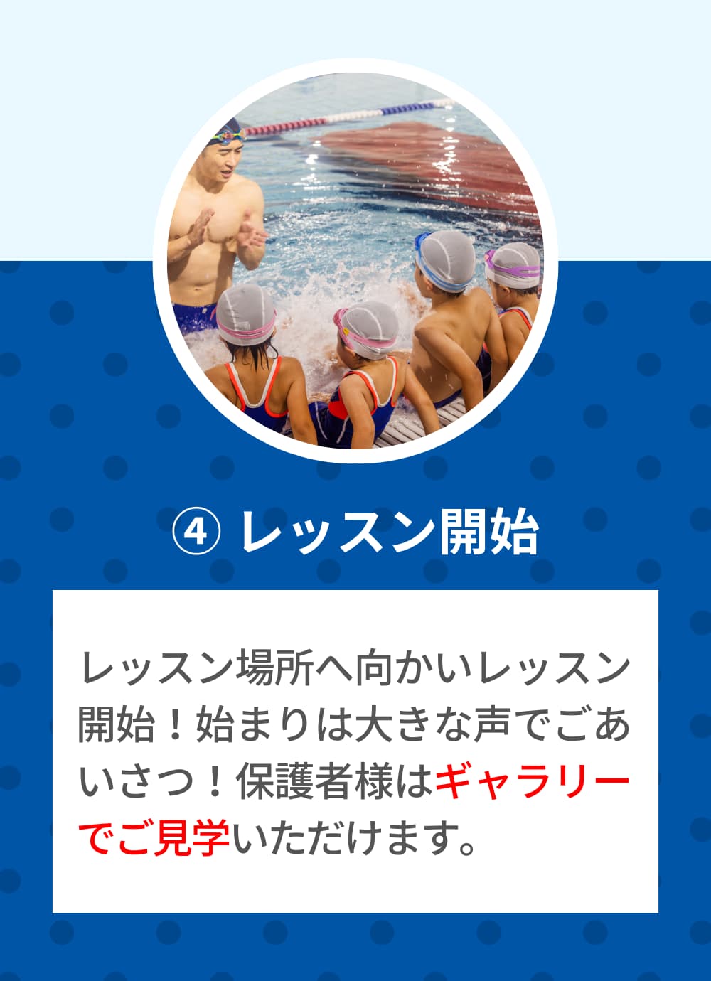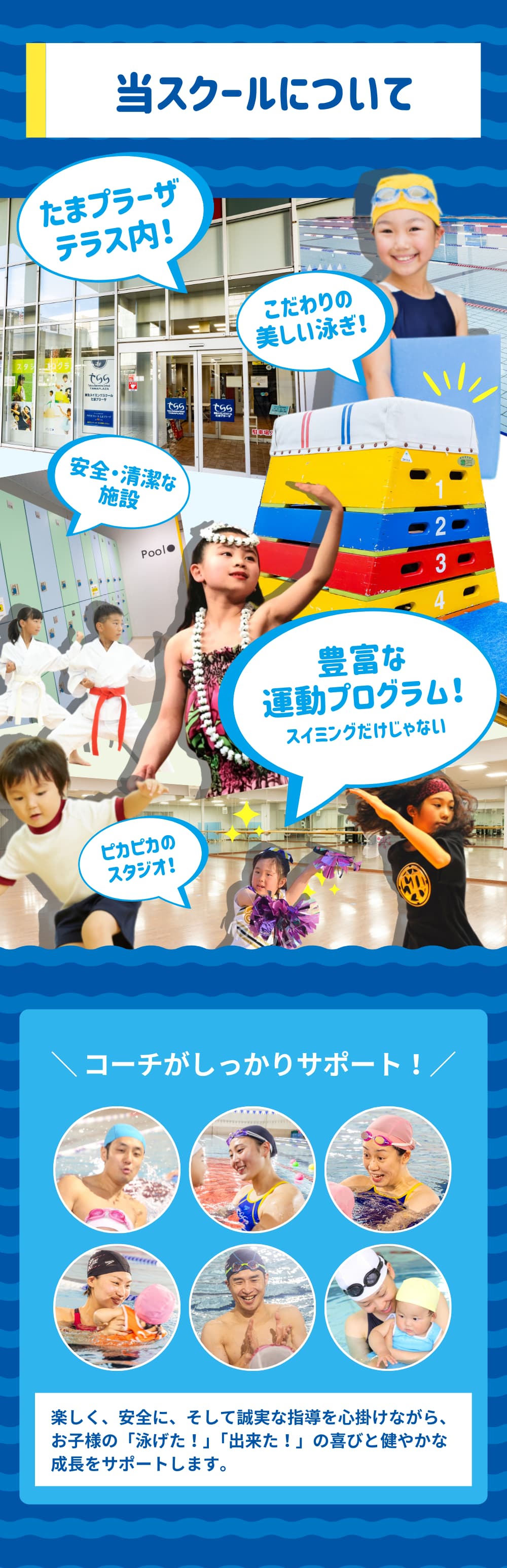 お子さまの笑顔と安心を守るために、水質管理からコーチの質まで徹底。異常を未然に防ぎ、万が一の緊急時もすぐ対応できる体制で、安心できる安全なスクールです。