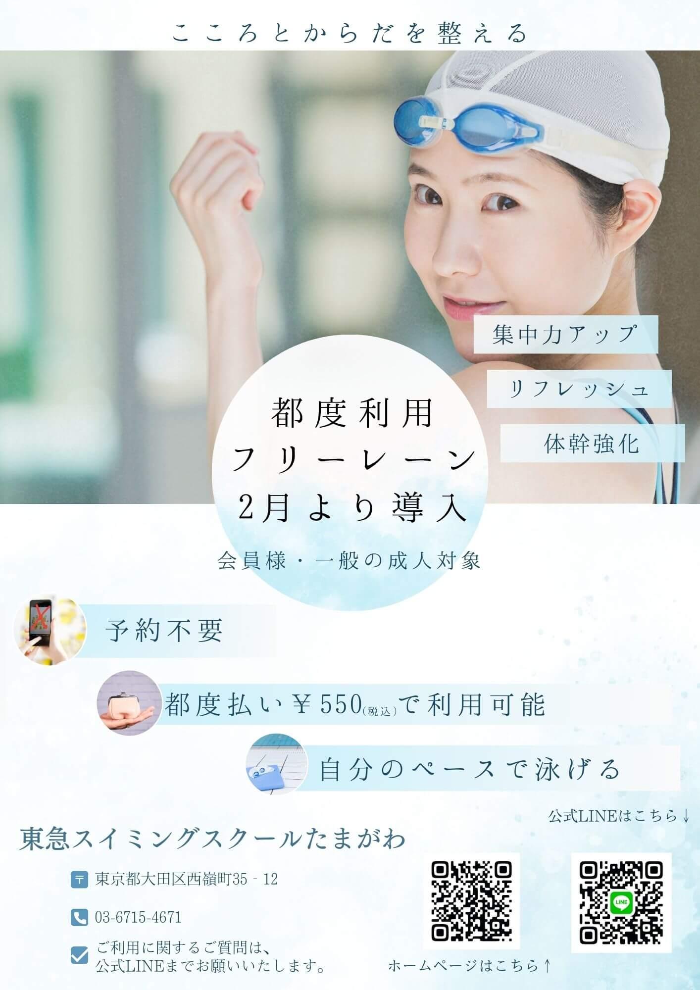 この度、東急スイミングスクールたまがわでは【ビジタースイム】として会員登録せず、都度利用が可能なフリーレーンを導入。
