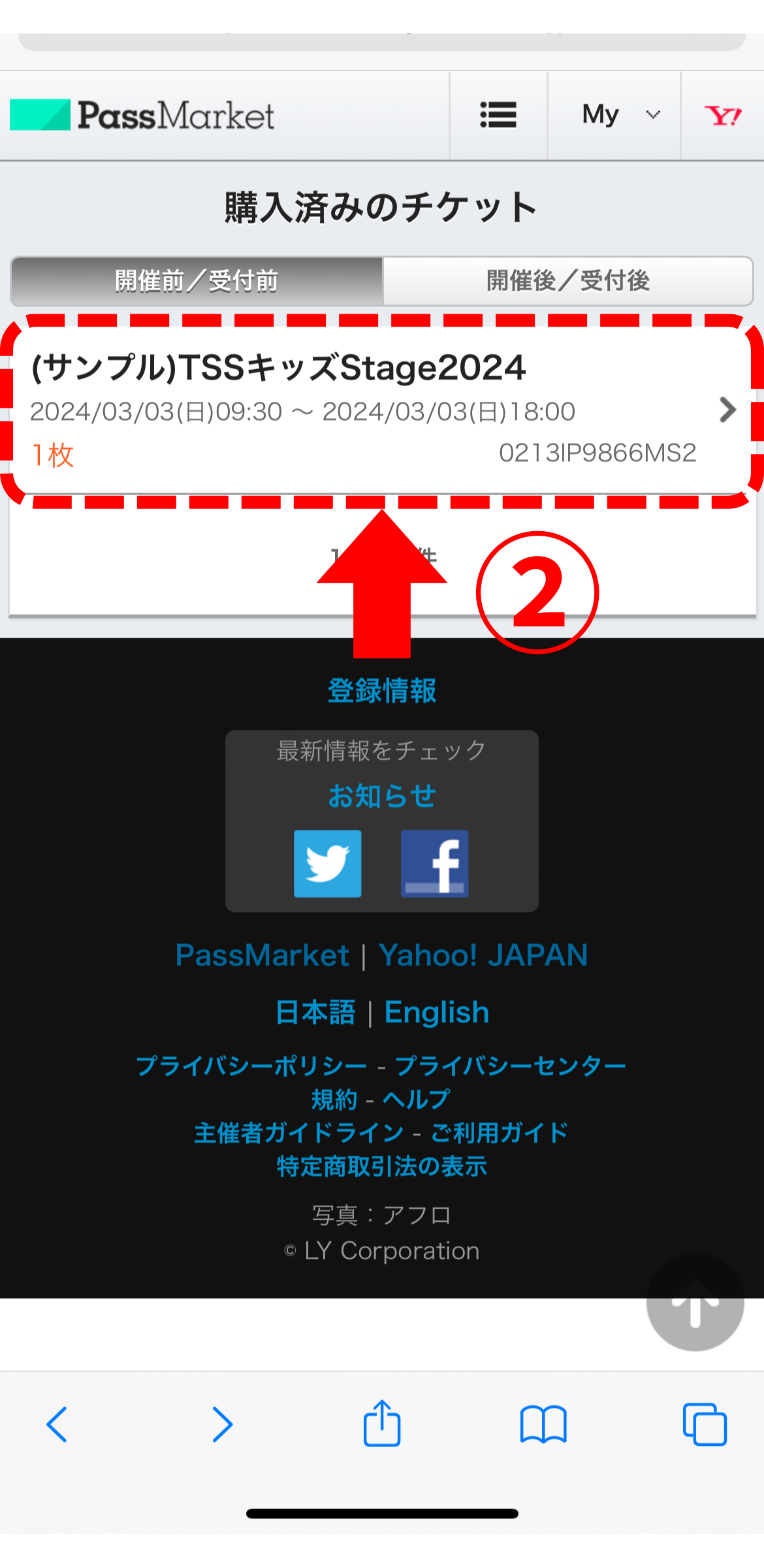 購入済のチケット画面から、【TSSキッズStage2026 大ホール入場整理券申込み】をタップする。