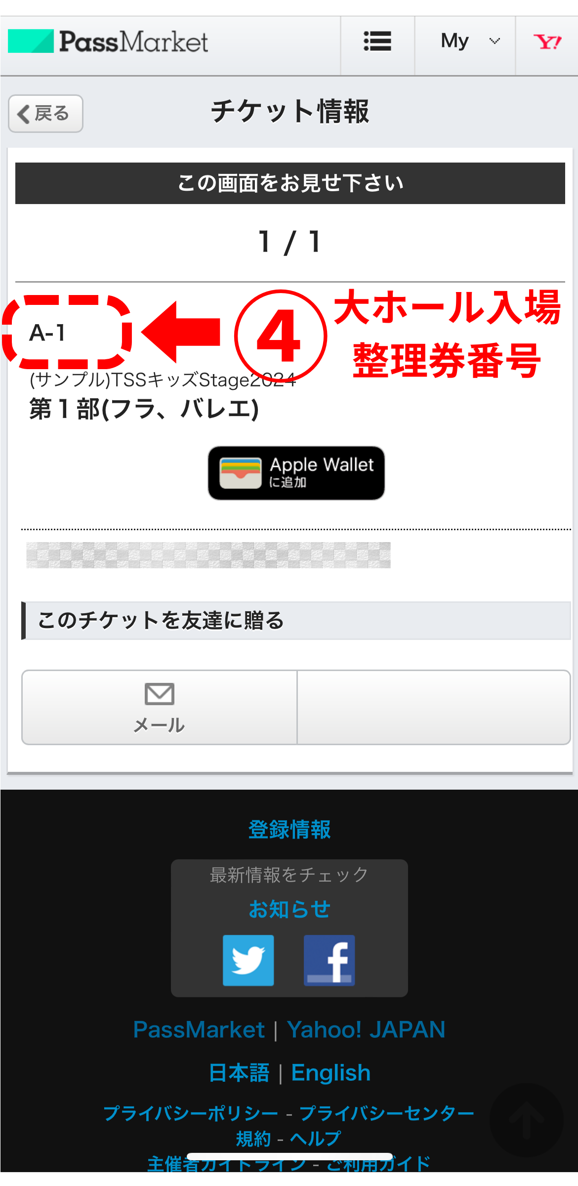表示された番号が整理券番号です。当日のホール入場受付時にスタッフに提示していただきます。