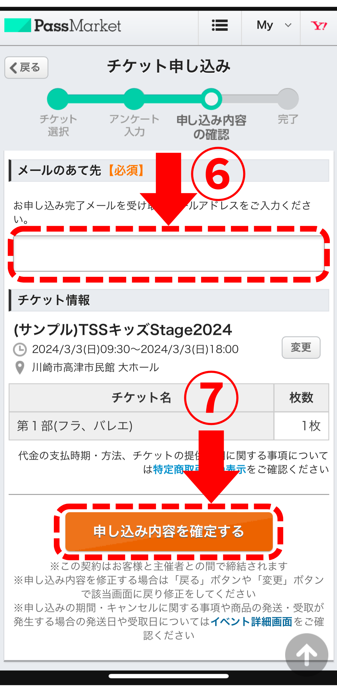 メールのあて先を入力し、申し込み内容を確定をタップする。